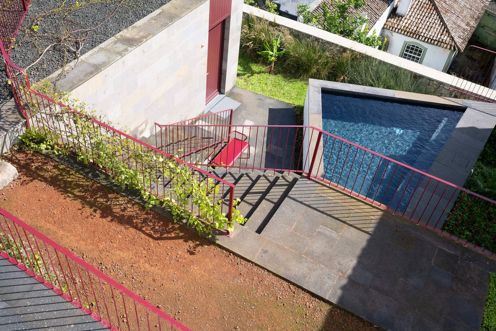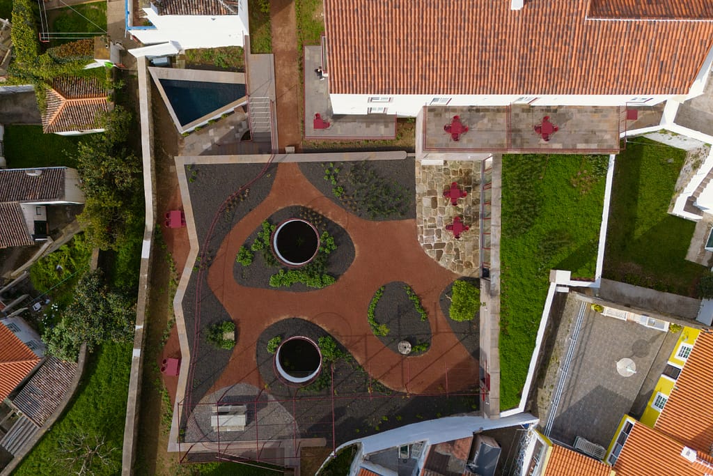 A recuperação paisagística do terreno envolvente privilegiou a conservação de espécies autóctones, a reconstrução dos muros tradicionais e a utilização de materiais regionais como o basalto, a bagacina e a criptoméria. O jardim e o tanque exterior sobre a paisagem encarregam-se do resto!